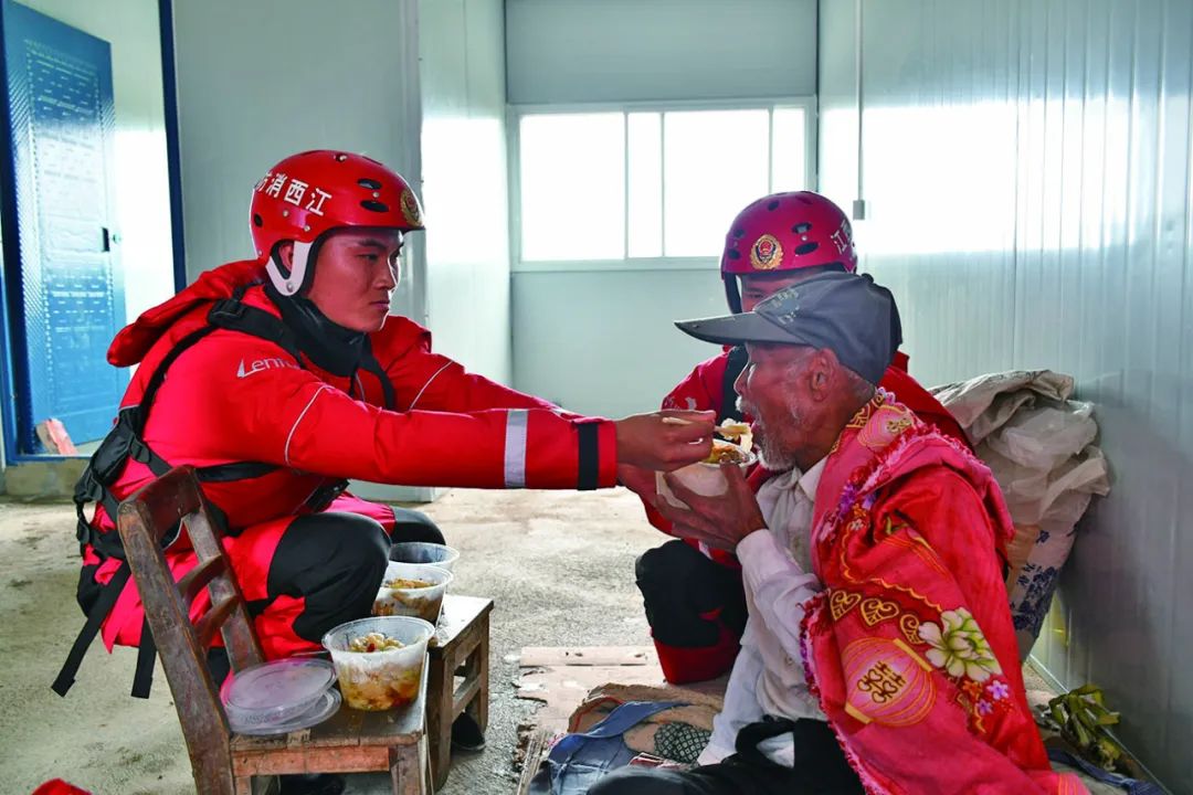 一名突擊隊(duì)員親切地握住老人瘦弱蒼老的手,和他耐心地交流起來。在老人囁嚅的聲音中,指戰(zhàn)員一遍又一遍地安慰著老人,告訴他“有我們?cè),不用怕”。隨后,抗洪突擊隊(duì)員又幫助老人打掃衛(wèi)生,整潔房間,并讓老人吃上了熱乎的飯菜。為了不讓老人嗆到,一名指戰(zhàn)員接過飯盒,一勺一勺地喂老人吃完,又為他留下了食用油、大米等日用品。